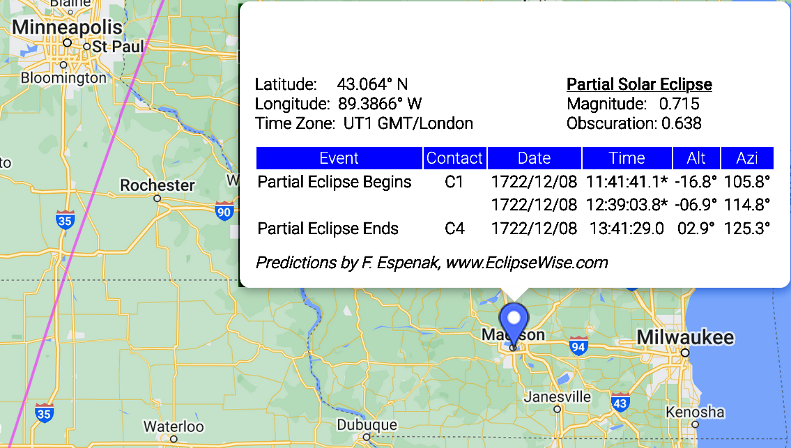 56 For the solar eclipse map, see: Fred Espenak and Jean Meeus, Five Millennium Canon of Solar Eclipses: -1999 to +3000 (2000BCE to 3000 CE), NASA/TP—2006—214141; Catalog of Solar Eclipses: 1701 to 1800; Global Eclipse Map, 1717 Oct 04.