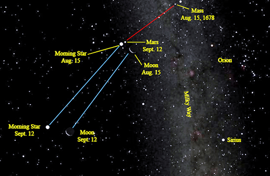 | Morning Star "Pulling Away" Mars and Mating the Moon, Aug. 15 - Sept. 12, 1678 |