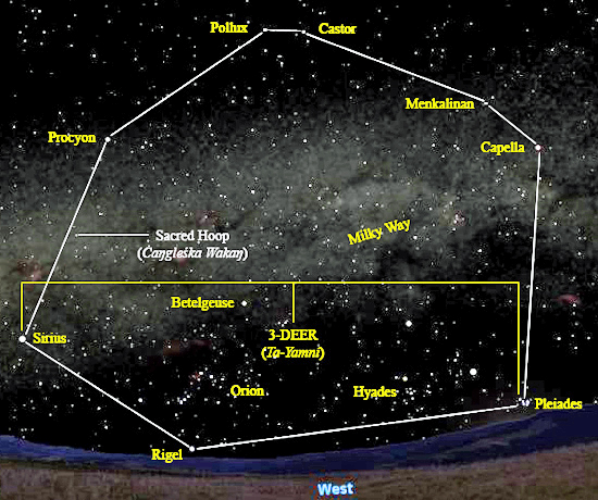 "the arrow crossed into the hoop, the rawhide unexpectedly changed into a young buffalo" — in addition to the obvious sexual imagery, this scene may symbolize an asterism as well. Given that this story is isomorphic to Wears White Feather, which is about Sirius and Morning Star, it should follow that this myth too pertains to celestial matters. As argued elsewhere, Sirius, Orion, and the Pleiades form a great and old (Central Siouan) asterism known as "Three Deer," based on reflexes in Sioux and Osage. This constellation is known to the Lakota as Ta-yamni, where ta refers ruminants generally, although they believe this asterism to be a buffalo. This is actually integrated into another asterism called Ċaŋgleśka Wakaŋ, "The Sacred Hoop" (also known as Ki Iŋyaŋka Oćaŋku, the "Race Track"). The ecliptic (the path of the sun) goes through the center of this hoop, and therefore corresponds to the path of the arrow. As the sun/arrow passes into the hoop, it simultaneous enters into the buffalo asterism (Tayamni). Then the buffalo Tayamni immediately dies (lies prostrate on the horizon, then sets). For the Hocągara, the arrow is mą, which also means "time," which is appropriate for the sun in its role as the definer not only of the year, but of various other times as marked by the heliacal rising and setting of certain stars. Back in May 10, 1678, this buffalo constellation, which in the past was really a deer asterism (Dakota, ta, "moose"; Omaha and Osage, ta, "deer"; Hocąk, ca, "deer"), lay nearly perfectly on the horizon when it was with the sun. So the ecliptic arrow passes just behind the "head" of the asterism, "killing" it, and causing to lie prostrate on the horizon. Given the double meaning of Hocąk mą as "time, arrow," it is doubtless time, through its measure the sun, that kills all. Thereafter, for a period of a few months, it is not seen. The tail of this asterism, formed by Sirius, rose with the sun on July 25, 1678. This neatly brackets the deer hunting season, which begins with the month of Mąįtawušira (May) and concludes at the end of Waxojrawira (July). The personification of the arrow is Hérokaga and his spirit tribe who govern the hunt. As the arrow-sun passes out of the hoop in early July (rising with Pollux), so the star of Hérokaga, Alnilam, also rises with the sun. The precession has thrown this off by about a half month as of the present year (2010). However, as long ago as 900 AD and earlier, it was still in good alignment with the deer hunting season. The sexual code makes the arrow-sun both the killer of the buffalo and the impregnator responsible for the generation of a buffalo from the rawhide hoop.