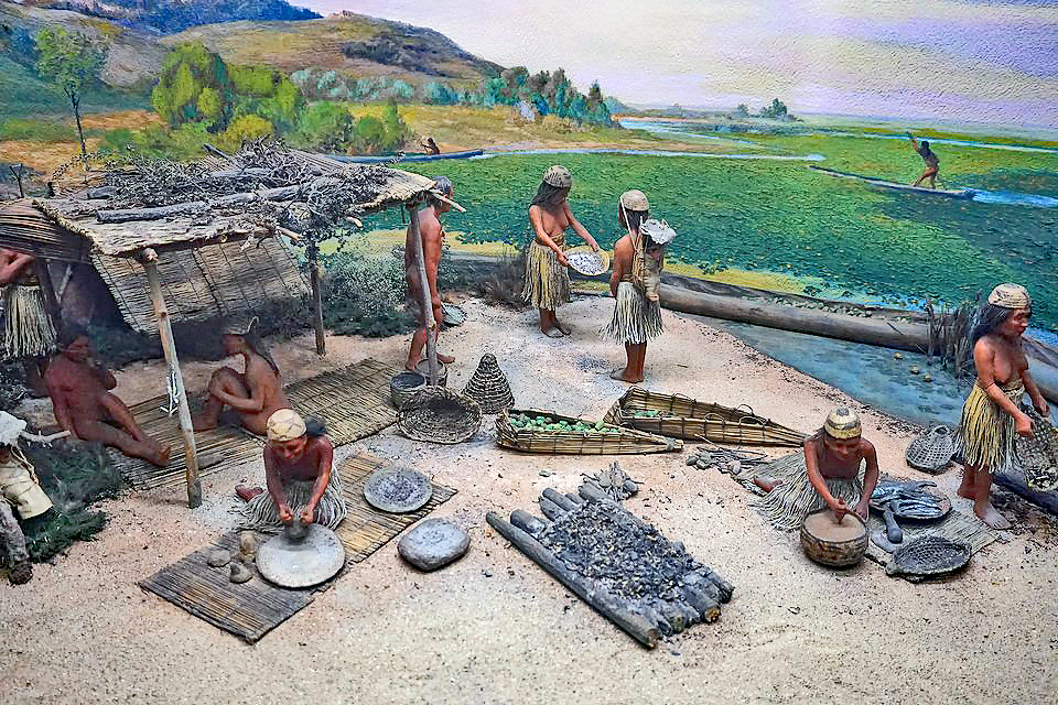 Yurok — a tribe belonging to the California Culture. Their name means "Downstream," a reference to their position on the Klamath River relative to the Karok people. The Yurok language, however, is Algonquian, the farthest west that any language of that phylum is to be found. Their staple food was the acorn, with a diet supplemented by hunting and fishing, particularly salmon. During the summer they were organized into nomadic bands, but in the winter they concentrated in larger villages. There they lived in rectangular houses with slanted cedar roofs. Social status was determined by wealth, and uniquely, the Yurok owned and sold land. Like the Hupa and Karok, their most important ceremony was the World Renewal Rite, in which the powers of the cosmos were recharged for the benefit of the tribe. After the gold rush of 1849, the Yurok lost most of their land. Nevertheless, today they own a number of rancherias neighboring the Hupa territory, as well as hotels and gaming resorts. Many Yurok live a hunter gatherer lifestyle like their ancestors. Parallel Stories: 1.