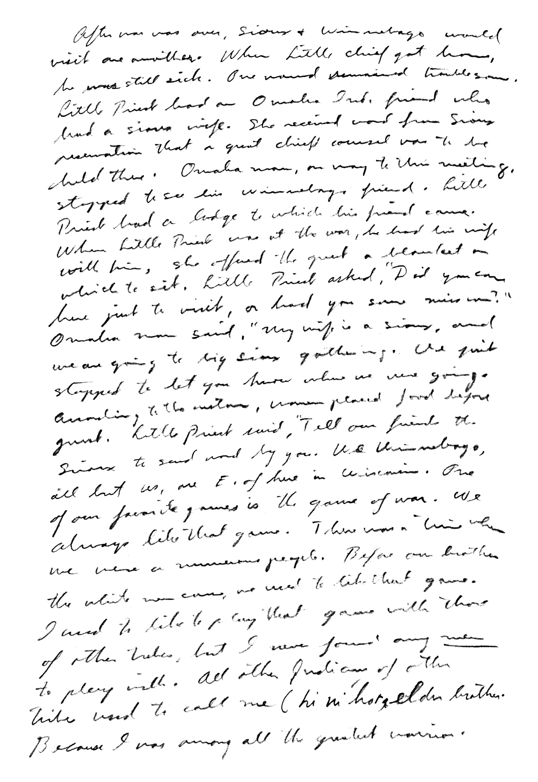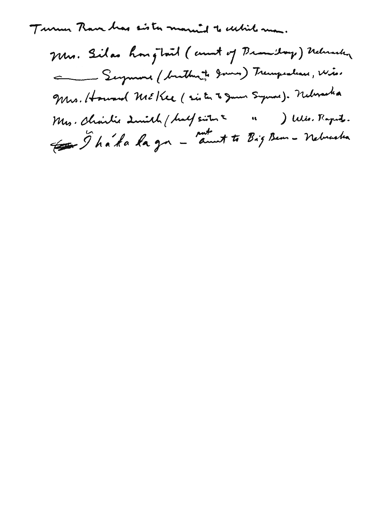 | Mrs. Silas Longtail (aunt of Brown boys) Nebraska ——— Seymore (brother to James) Trempealeau, Wis. Mrs. Howard McKee (sister to James Seymore). Nebraska Mrs. Charlie Smith (half sister = " ) Wis. Rapids. (... Ĩhákalaga – pat aunt to Big Bear – Nebraska |
