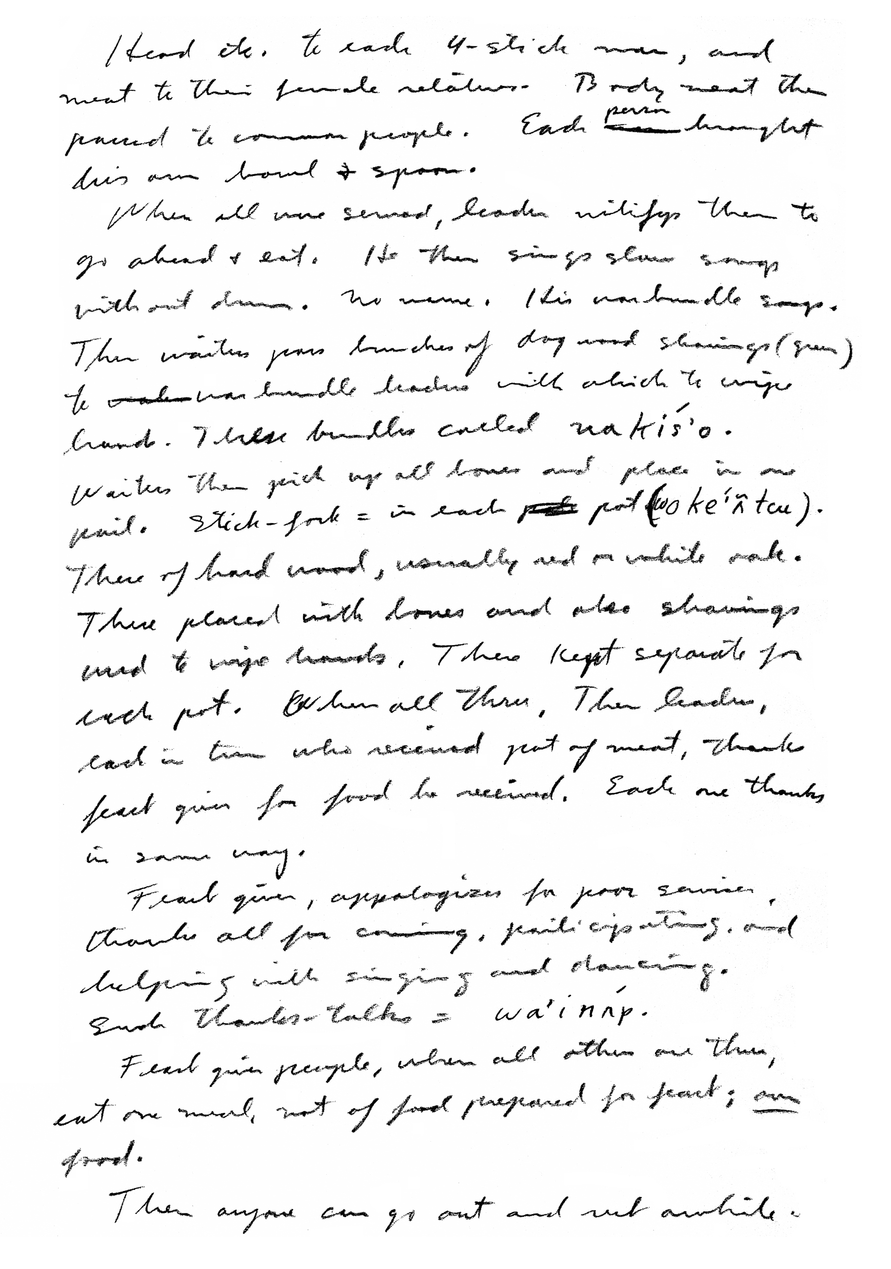 to town to get work, so that she could buy food for the meeting. So she found work in town. The money she saved until she should get enough for her purposes. Finally, she had enough. When she got home, she used a team for gathering wood to be used at the meeting. Everything was gotten ready. The tent was erected. Somebody was notified to lead the meeting. When all was ready, the people were assembled. They came over about noon and had both dinner and supper. She did all the work herself. When they were ready to enter the tent, the leader led them in. The leader asked her if she wanted to say something. She got up and said, "My brothers, you know that my father and mother were peyote people. One day I saw all the things that had not been used for a long time. I thought I would call a meeting so that they might be used again. So I have worked hard to get that which was necessary, and now all is ready. So I have called you. I have thought like this, I would notify you people, brothers and sisters. You know, my parents, when alive, treated me nice in every way. Since I was their only child. When I was grown, I married a man, and his treatment of me was like