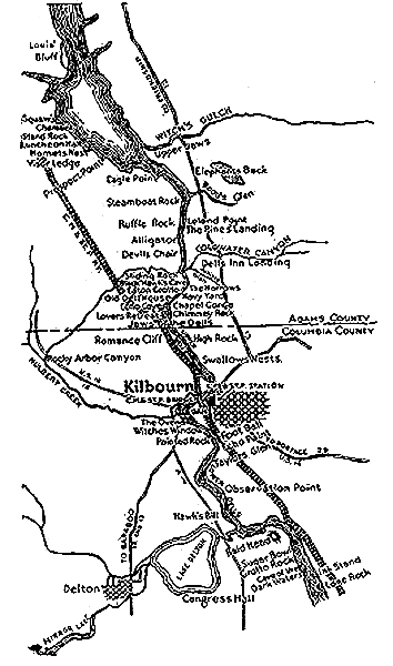 There was a village in Nįš-hakí-sųc-ra (Wisconsin Dells) in which lived a young man and a girl who loved him very much. The girl was called "White Flower" (Š’esgaga?). The young man, Hotonga, was a very good hunter. One day they agreed to go away from the village to be alone together. He would go hunting that day and she would meet him in Chapel Gorge. She waited at the rendezvous site, but he never appeared. She was still waiting for him when the moon rose like a birchbark canoe. He would never come: while he was hunting, Hotonga was ambushed and killed by a Šąhą (Sioux) warparty. Every night she would return to their rendezvous spot on Pulpit Rock [below], but every night he failed to appear. She cried much and would not eat, so she began to waste away. Finally, the spirits took pity on her and transformed her into a white flower. Whenever any winged creature visits this flower, the blossom holds it and never lets it go.1
